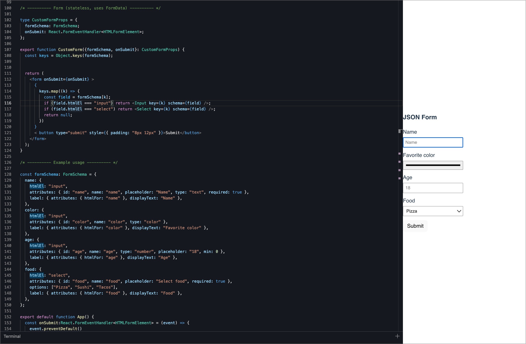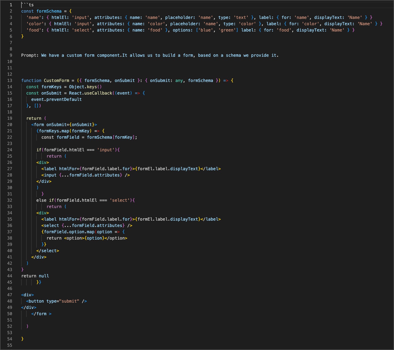 function CustomForm = ({ formSchema, onSubmit }: { onSubmit: any, formSchema }) => {